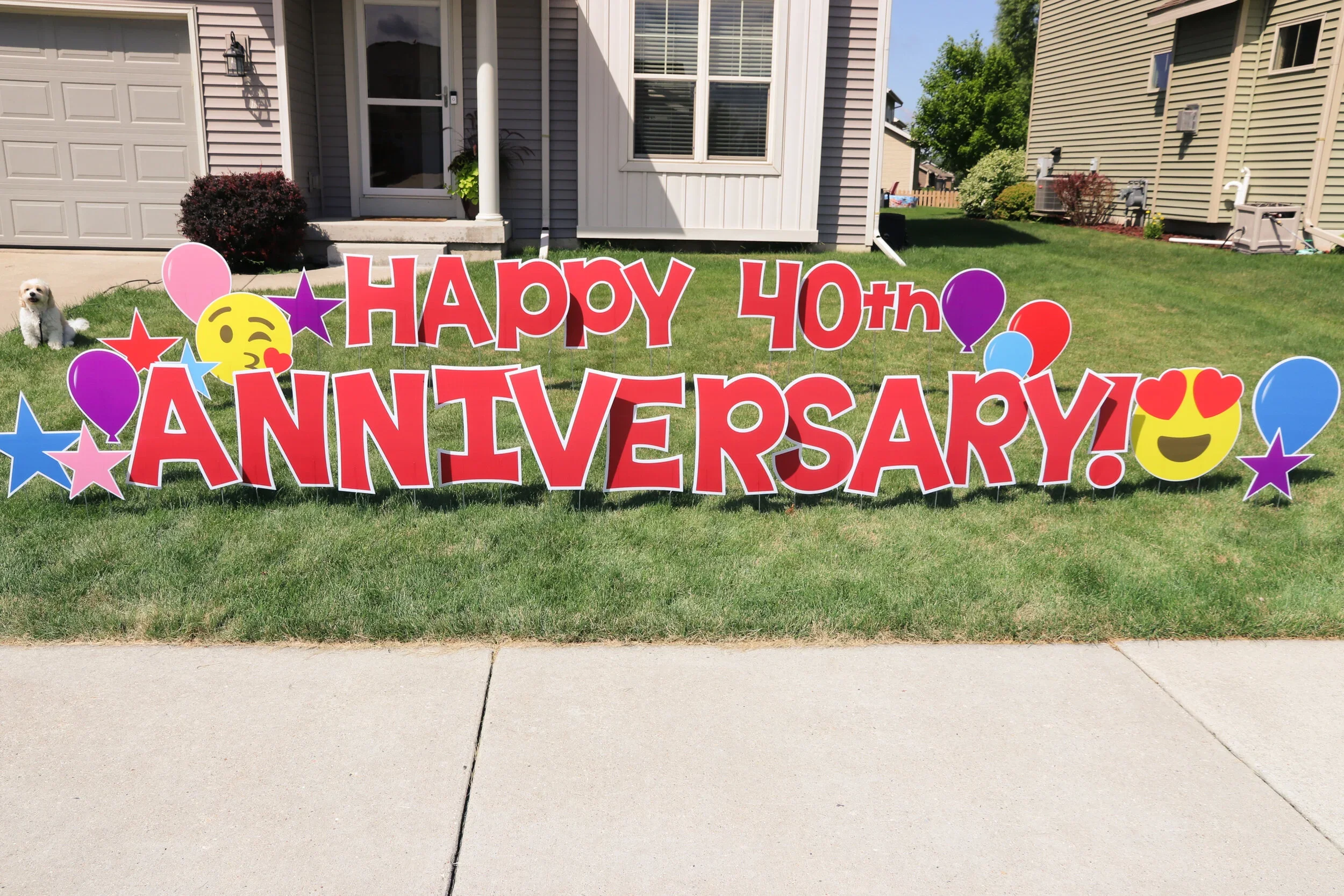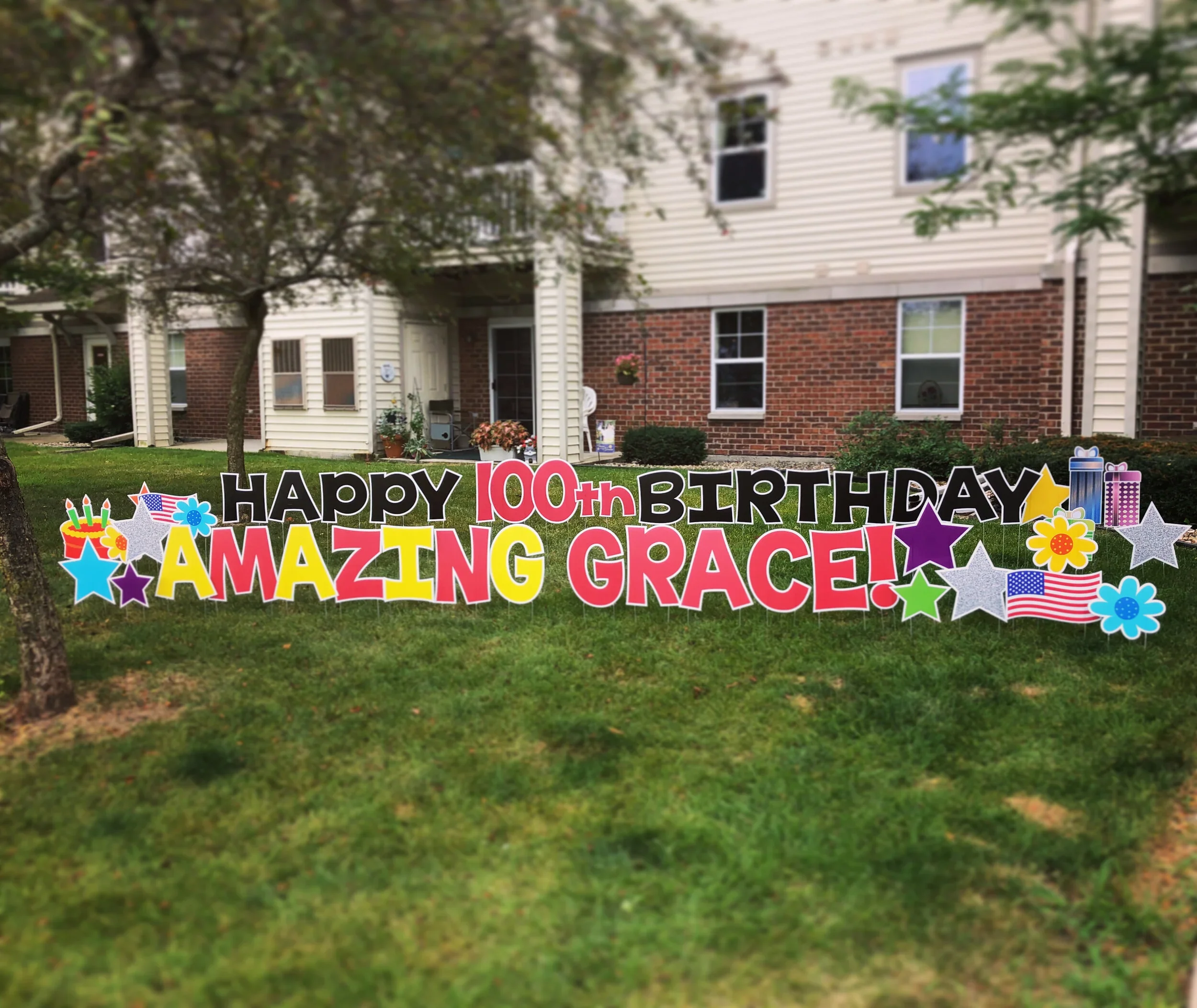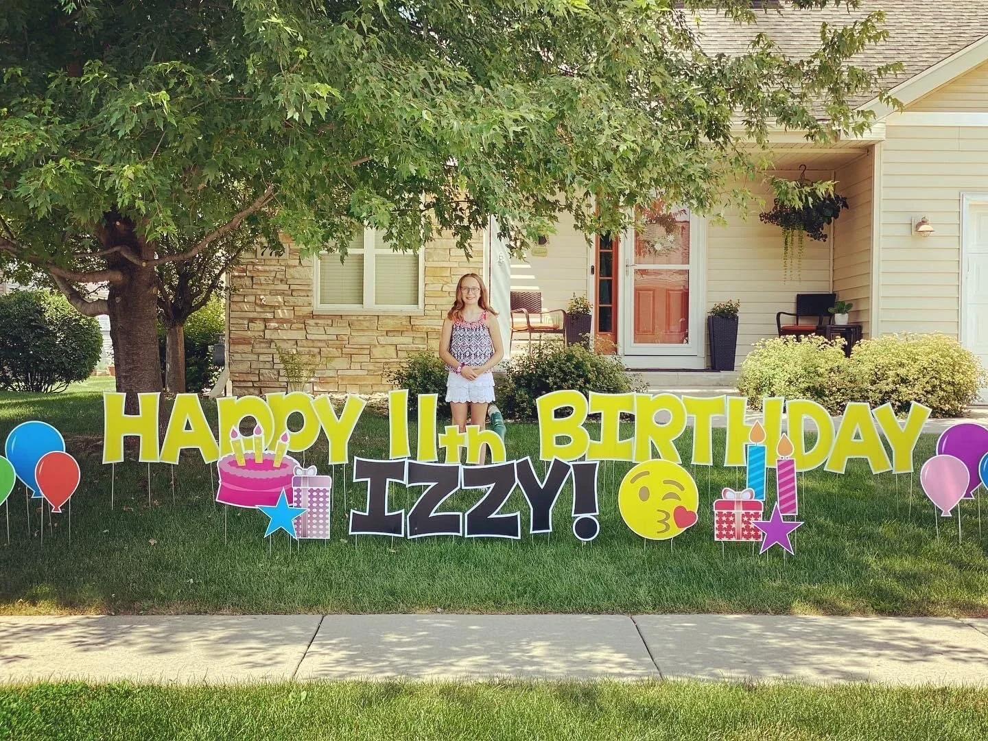 Pricing includes your personalized greeting, delivery, set up and pick up, all within a 24 hour time frame. (Example: “Happy 10th Birthday Maddie!” along with several accessory signs that compliment the greeting.)